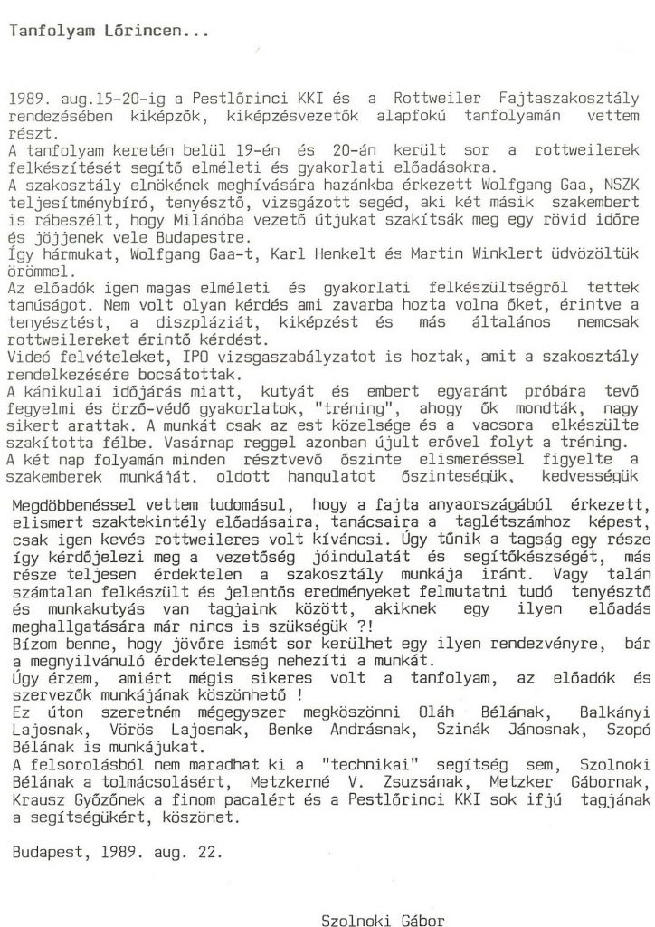 Rajtunk kívül és a hozzánk járó rottweilereseken kívül, kevesen érdeklődtek a rendezvény iránt. A keveset értsd úgy, hogy az akkori rottweileres létszámhoz képest voltunk kevesen, meg ahhoz képest, hogy milyen komoly szakemberek jöttek. Az akkori kor, menő versenyzői, kiképzői sem érezték fontosnak, hogy a rottweilerről tanuljanak bármit is, hiszen más fajtában voltak érdekeltek, meg egyébként is mindent tudtak! ( hitték magukról)