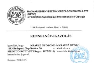 Már a tenyésztés elhatározásakor, kennel nevet kell váltani. FCI rendszerben, FCI nyilvántartással kutyáziunk, ezért erről egy igazolást kapunk, melyet az FCI tag, kinológiai csúcsszerv MEOESZ állít ki. Névre szóló és egy ember, egyet válthat ki, de a kennelnek lehet társtulajdonosa is. Akkor ketten szerepelnek tenyésztőként a fajta törzskönyvében és ezt olvashatod a származási lapokon is. Majd ezen a kennel néven jelentheti be az almot a tenyésztő.
