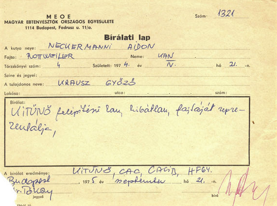 4 év múlva, több sikertelen próbálkozás után, megszületett az első rottweiler alom Magyarországon. Két kiemelkedő képességű és formájú kan született, akik tovább éltették a” legendát.” Mindkettő szép és jó! Alkon ICH= Inter-Champion, Arnold HCH=Hungária-Champion mindketten MK/2 =Munkakutyavizsga/2 középfokon képzett, munkavizsgával.