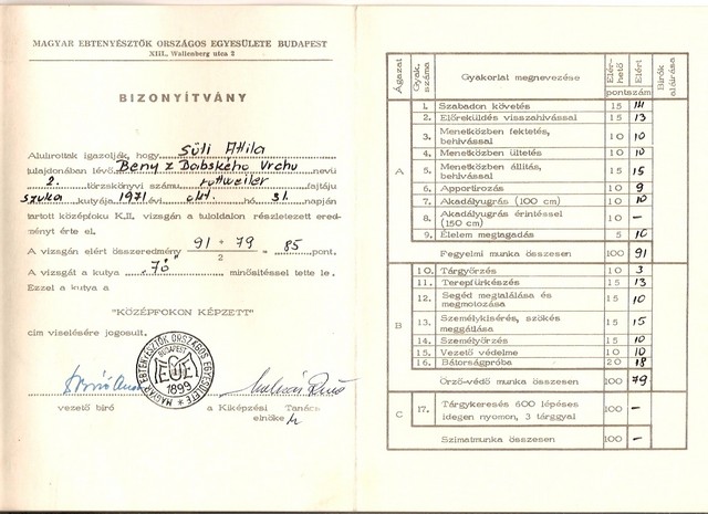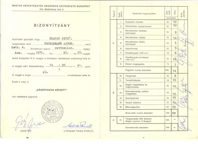 Erős, határozott egyéniségű, kemény kutya, nagyon jó őrző-védő. NDK-ban láttam, amikor ott jártam a hadseregnél, erősítette meg a fajta jellemzését Gyula bá’. Szemből a kép jobb szélén láthatod Fehér Gyula sporttársat, aki a tipp adó volt anno. Középen Kovács Károly-Karcsi bácsi , a IX-k. KKI iskola vezetője látható.